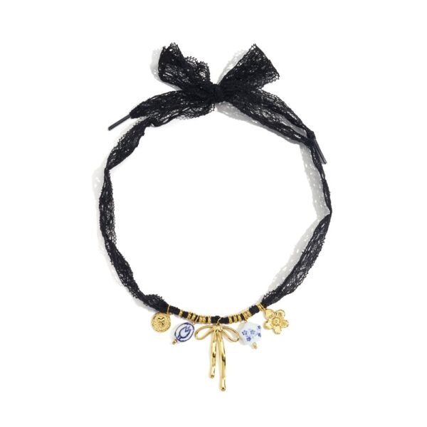 Collar de encaje negro con detalles dorados en acero inoxidable y charms inspirados en la elegancia clásica: lazo central, medallones y piezas cerámicas estilo porcelana. La Collar Belle Noire combina romanticismo y carácter en una joya única que evoca el encanto vintage con un toque contemporáneo. Perfecto para dar un aire sofisticado y atrevido a cualquier look.