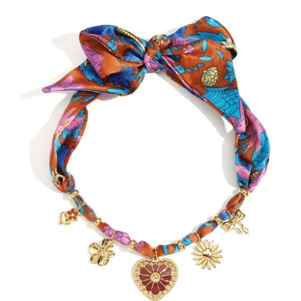 Collar de acero inoxidable con cinta de seda estampada en tonos tierra, azul y violeta, decorado con charms dorados y un corazón esmaltado en rojo con flor central. Su diseño mezcla el encanto artesanal con un aire romántico y vibrante. El Collar Corazón Boheme es la pieza ideal para quienes buscan un accesorio único, lleno de color, personalidad y energía positiva.