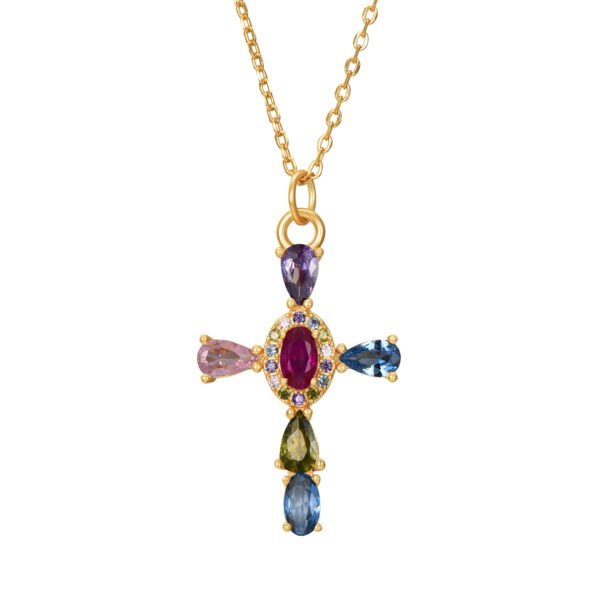 El Collar Cruz Royale está elaborado en plata 925 bañada en oro de 18k, protagonizado por una cruz formada por circonitas multicolor en talla pera y oval, que se combinan para crear un efecto vibrante, elegante y único.