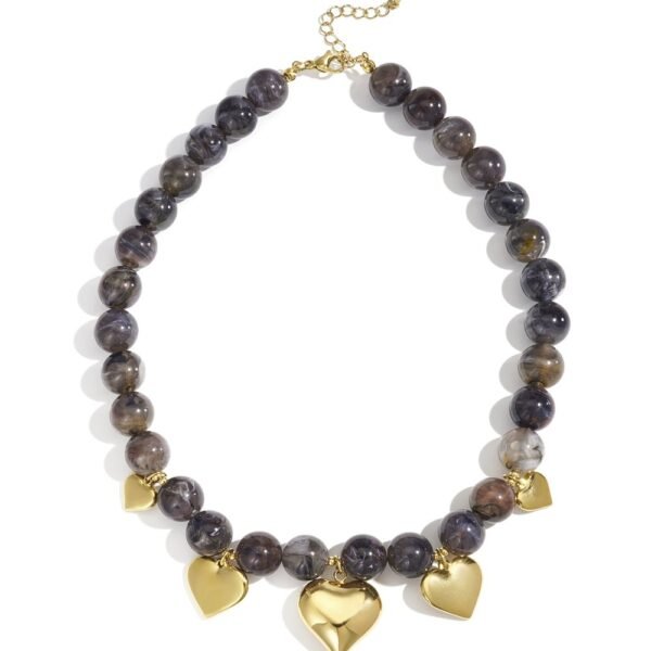 Collar de acero inoxidable con cuentas pulidas y colgantes en forma de corazón dorado. Disponible en tonos rubí y gris perlado, combina un aire romántico con un acabado sofisticado. Su diseño aporta brillo, carácter y elegancia a cualquier look. Ajustable y resistente al agua.
