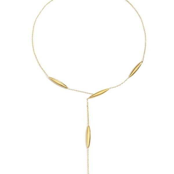 Collar de acero inoxidable dorado con diseño tipo “Y” y detalles alargados pulidos que aportan un toque moderno y sofisticado. El Collar Élan destaca por su elegancia minimalista y su caída delicada, ideal para realzar el escote con un brillo sutil. Perfecto tanto para looks formales como para un estilo refinado de día