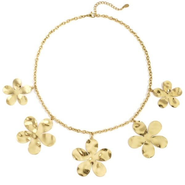 El Collar Flora Doré es una oda a la feminidad luminosa y al poder natural. Fabricado en acero inoxidable con acabado dorado espejo, destaca por sus cinco flores de pétalos irregulares martillados que capturan la luz con cada movimiento. Su diseño artesanal combina fuerza y delicadeza, evocando un estilo bohemio y elegante a la vez. Perfecto para realzar un escote o añadir un toque artístico a cualquier look, es una joya que celebra la belleza en su forma más libre y dorada.