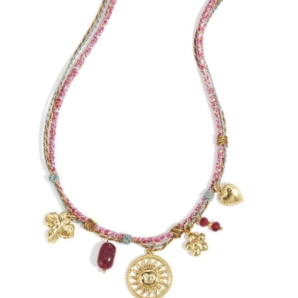 Collar de acero inoxidable con cordón trenzado multicolor y dijes dorados que evocan energía, amor y fortuna. Destacan el sol central, símbolo de poder y vitalidad, junto a pequeños charms de corazón, flor y piedra en tono vino. El Collar Soleil combina alegría, luz y estilo bohemio con un toque de lujo dorado.