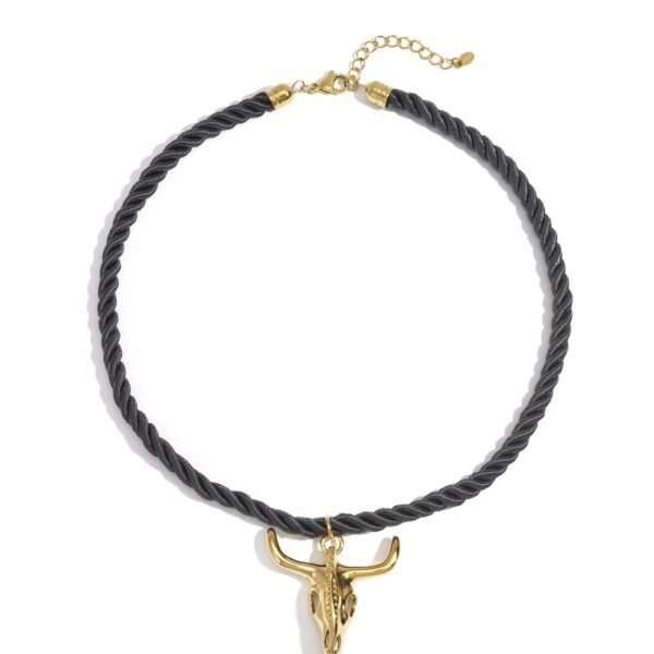 El Collar Wildhorn irradia fuerza y autenticidad con un toque contemporáneo. Su diseño fusiona una cuerda trenzada negra con un colgante de cabeza de toro en acero inoxidable dorado, símbolo de coraje y libertad. Esta pieza, de aire bohemio y carácter indomable, está pensada para mujeres seguras que expresan su poder interior con estilo. Ideal para destacar looks urbanos o añadir un toque salvaje a un conjunto elegante.