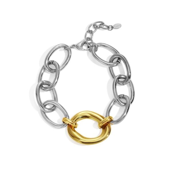Su eslabón central, de forma orgánica y acabado pulido, simboliza la conexión entre luz y energía. Resistente al agua, perfume y sudor, es una pieza que mantiene su brillo impecable y su carácter audaz en cada uso.
